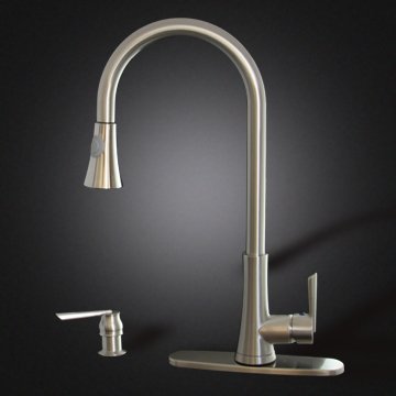Brushed Nickel Kitchen Sink Faucet Pull Out Spray with Soap Dispenser and Deck Cover Plate Feature